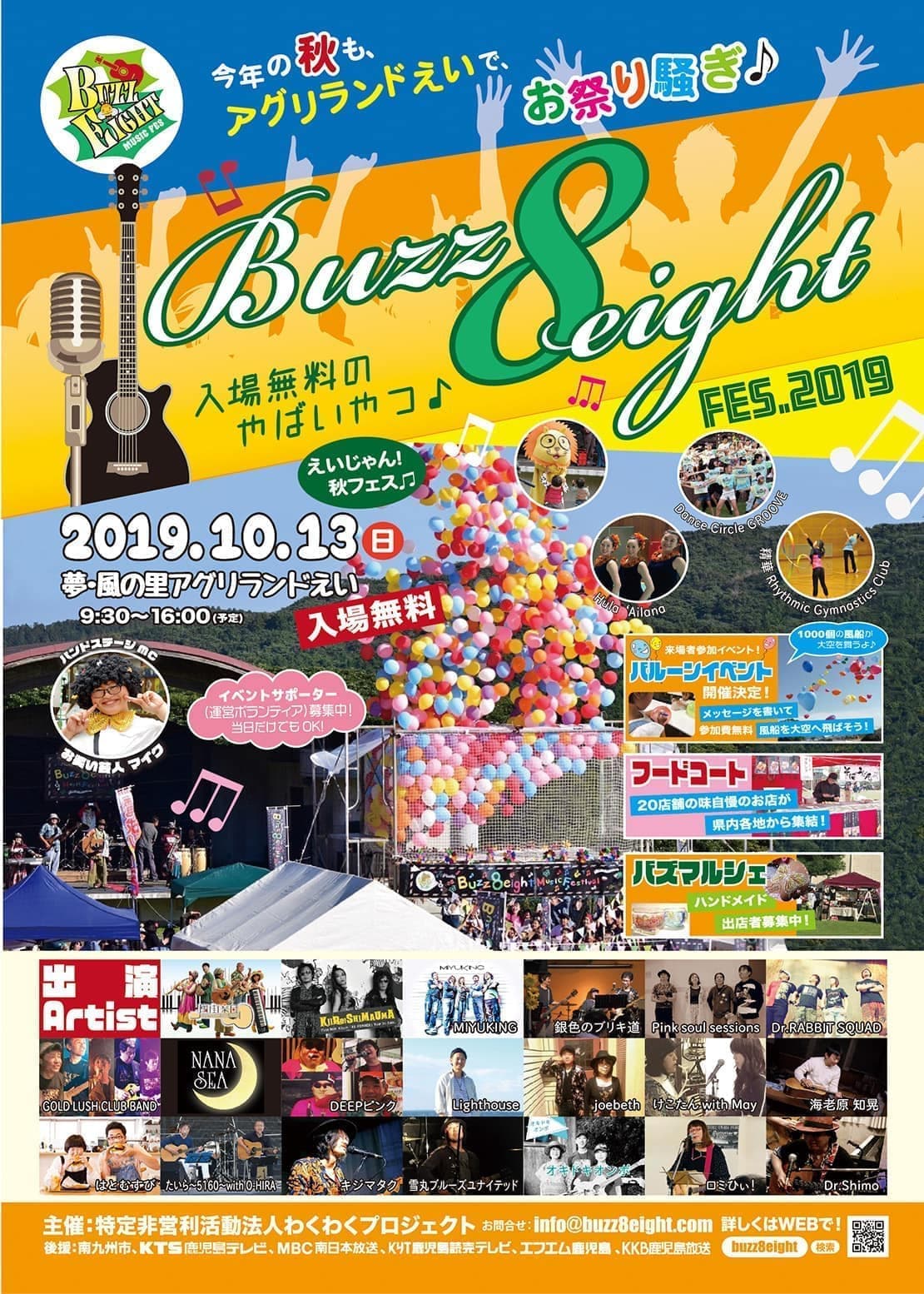 Buzz8eightFes.2019〜入場無料のやばいやつ〜 会場:アグリランドえい 入場無料 【出演アーティスト】 ■バンドステージ 風街楽団、MIYUKING、GOLD LUSH CLUB BAND、黄色いシマウマ、NANASEA、PinkSoulSessionS、DEEPピンク、銀色のブリキ堂、Dr.RABBIT SQUAD ■アコースティックステージ たいら〜5160〜with0-HIRA、ロミひぃ!、joebeth、Dr.Shimo、けこたんwith May、はとむすび、オキドキオンポ、Lighthouse、海老原知晃、ゆきまるブルーズユナイテッド、キジマタク MC:お笑い芸人マイク、中尾聖 目玉イベント:1000個のバルーンリリース、一発勝負の大抽選会