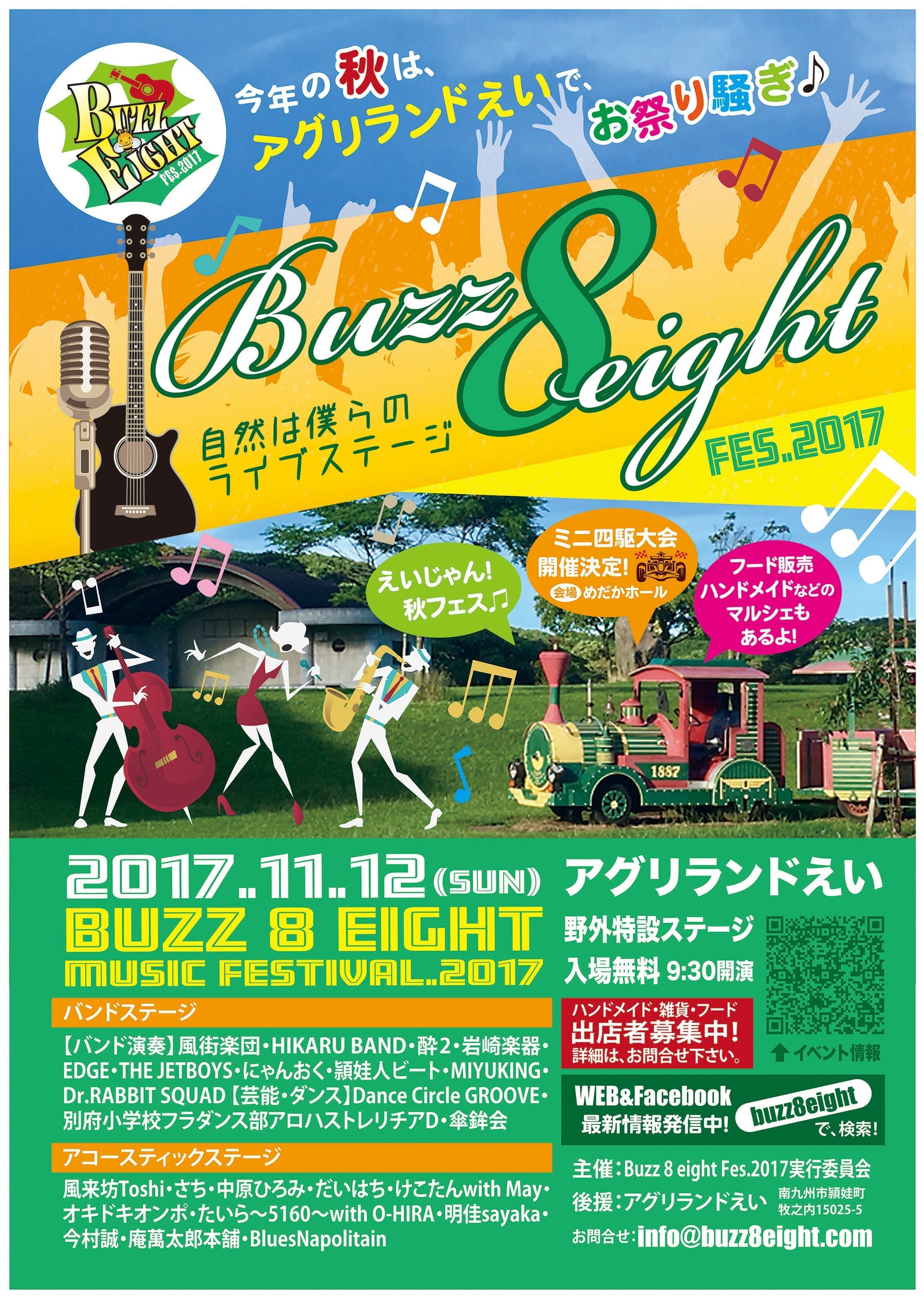 Buzz8eightFes.2017〜自然は僕らのライブステージ〜 会場:アグリランドえい 入場無料 【出演アーティスト】 ■バンドステージ 酔2、Dr.RABITTO SQUAD、EDGE、風街楽団、頴娃人ビート、HIKARUBAND、THE JETBOYS、岩崎楽器、にゃんおく、MIYUKING ■アコースティックステージ たいら〜5160〜with O-HIRA、中原ひろみ、さち、BluesNapolitan、けこたんwith May、庵萬太郎本舗、オキドキオンポ、明佳sayaka、今村誠、風来坊Toshi