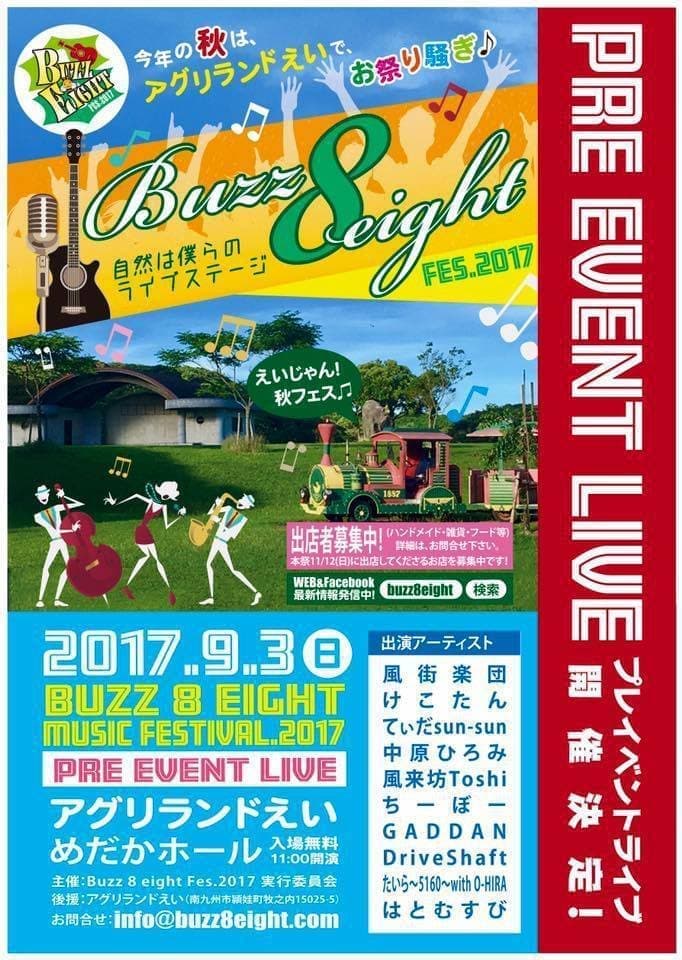 Buzz8eightFes.2017プレイベント 会場:アグリランドえい めだかホール 入場無料 【出演アーティスト】 風街楽団、けこたん、てぃだsun-sun、中原ひろみ、風来坊Toshi、ちーぼー、GADDAN、Driveshaft、たいら〜5160〜with O-HIRA、はとむすび